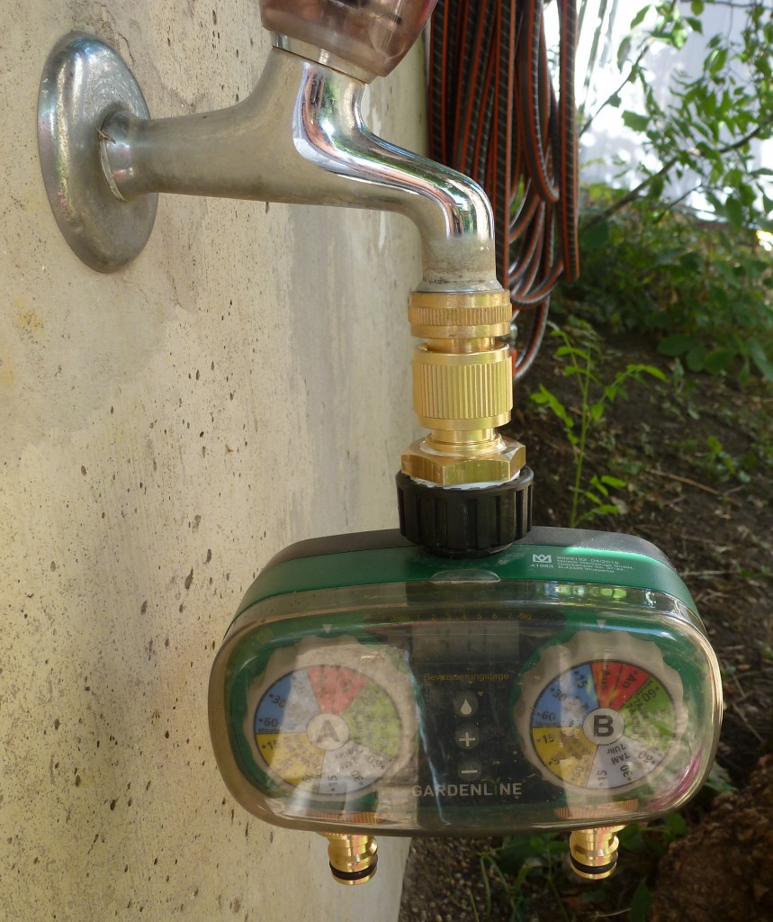 Dabei ist mir aufgefallen, das unser Bewässerungs-Computer undicht ist, der Schaden scheint im inneren des Gerätes zu sein, ich musste den leider abmonieren, es steht jetzt daher nur mehr ein Anschluss zu Verfügung, das ist aber nicht weiter schlimm, der Druck hat siewieso nicht für beide Rasensprenger gleichzeitig gereicht. Ich habe das Ding in den Hobbyraum in eine Schachtel gelegt. Vielleich bastle ich ja mal ein kleines Kästchen, mit zwei Magnetventilen und einer Computer (Arduino) Steuerung – ist jetzt aber nur so eine Idee von mir – wahrscheinlich lassen wir es wie es ist, wir sind so lange ohne dem ausgekommen, oder wir leisten uns einfach so ein Y-Stück, welches rein mechanisch ist.