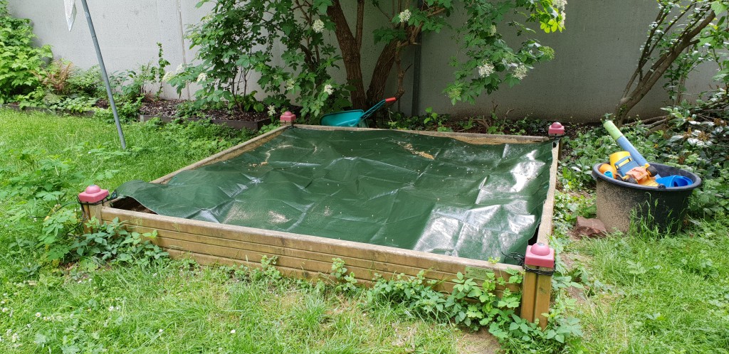 Für die Sandkiste gibt es jetzt eine Abdeckplane – Danke an Marion [Top 1] fürs besorgen.