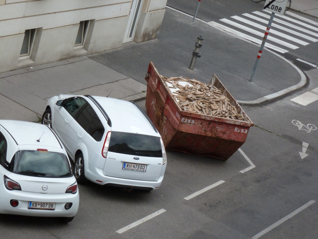 Heute ist mir in unserer Strasse ein Mulden-Container aufgefallen, voll mit Bauschutt aber auch mit Holz.