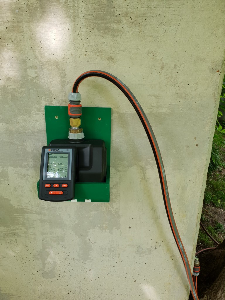 Es hat leider etwas länger gedauert, aber ich habe eine Halterung für den Bewässerungscomputer gebaut und auch schon montiert.