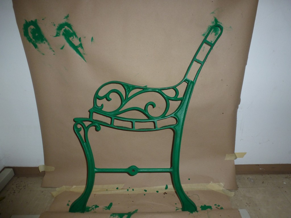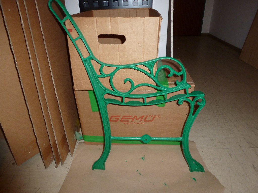 Heute Nachmittag begonnen die Metallteile der Bank zu streichen, mit der zuvor besorgten Farbe (Grundierung und Lack in einem) hat ganz gut funktioniert. Sehen fast aus wie neu – ich hoffe, Grün war ok, war sie vorher auch.