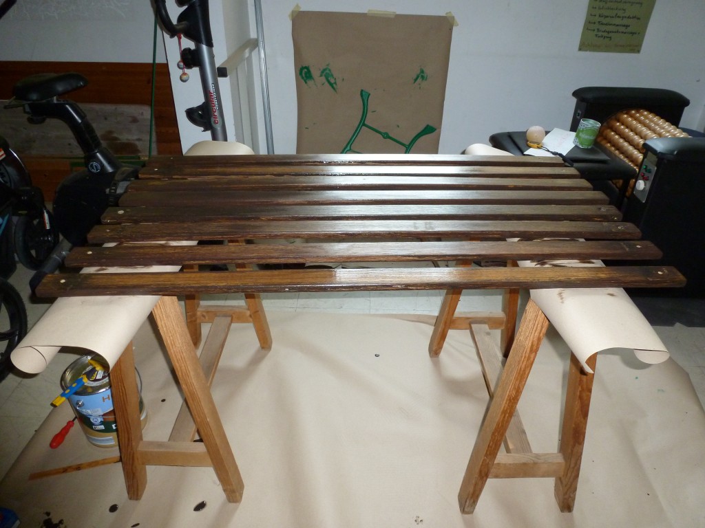 ➡ Heute (25.09.2016) den Teilen einen zweiten Anstrich verpasst, jetzt sind alle Stellen abgedeckt, jetzt können wir uns über die Bretter machen und danach kann man die Bank wieder zusammen setzen.