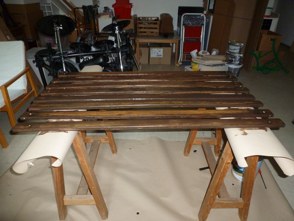Die Teile stehen zum trocknen im Hobbyraum, ich werde da noch ein zweites mal drüber streichen, da nicht alle Stellen gut abdecken, außerdem kann eine zweite Schicht nicht schaden, das Teil soll ja wieder eine Weile halten. Die Bretter werden demnächst drann kommen.