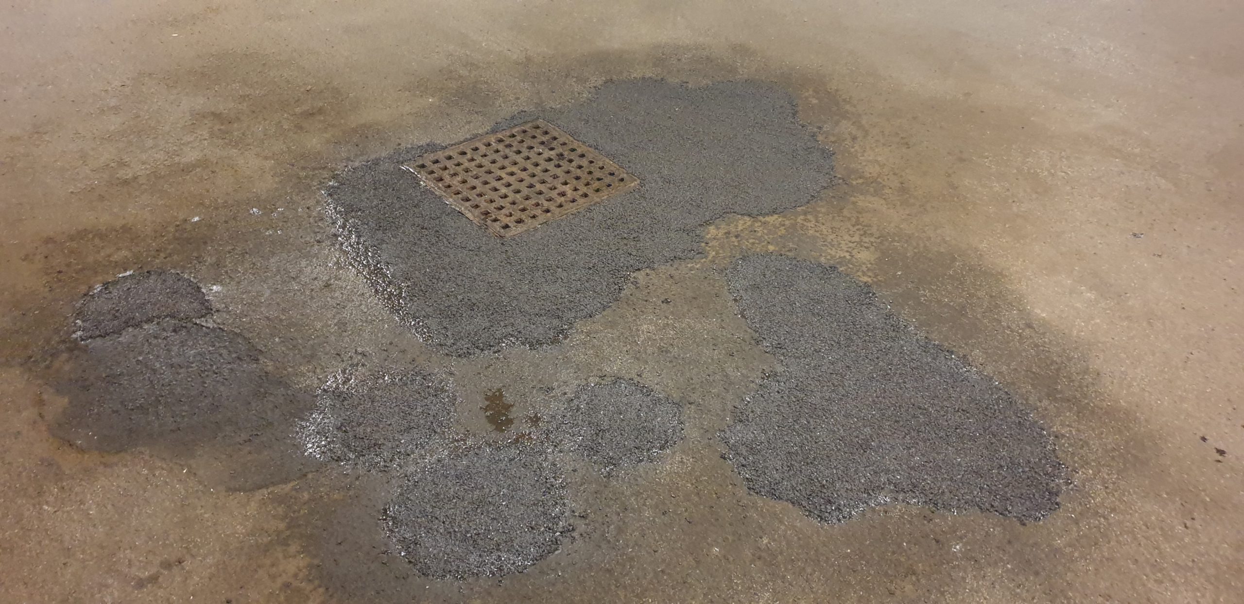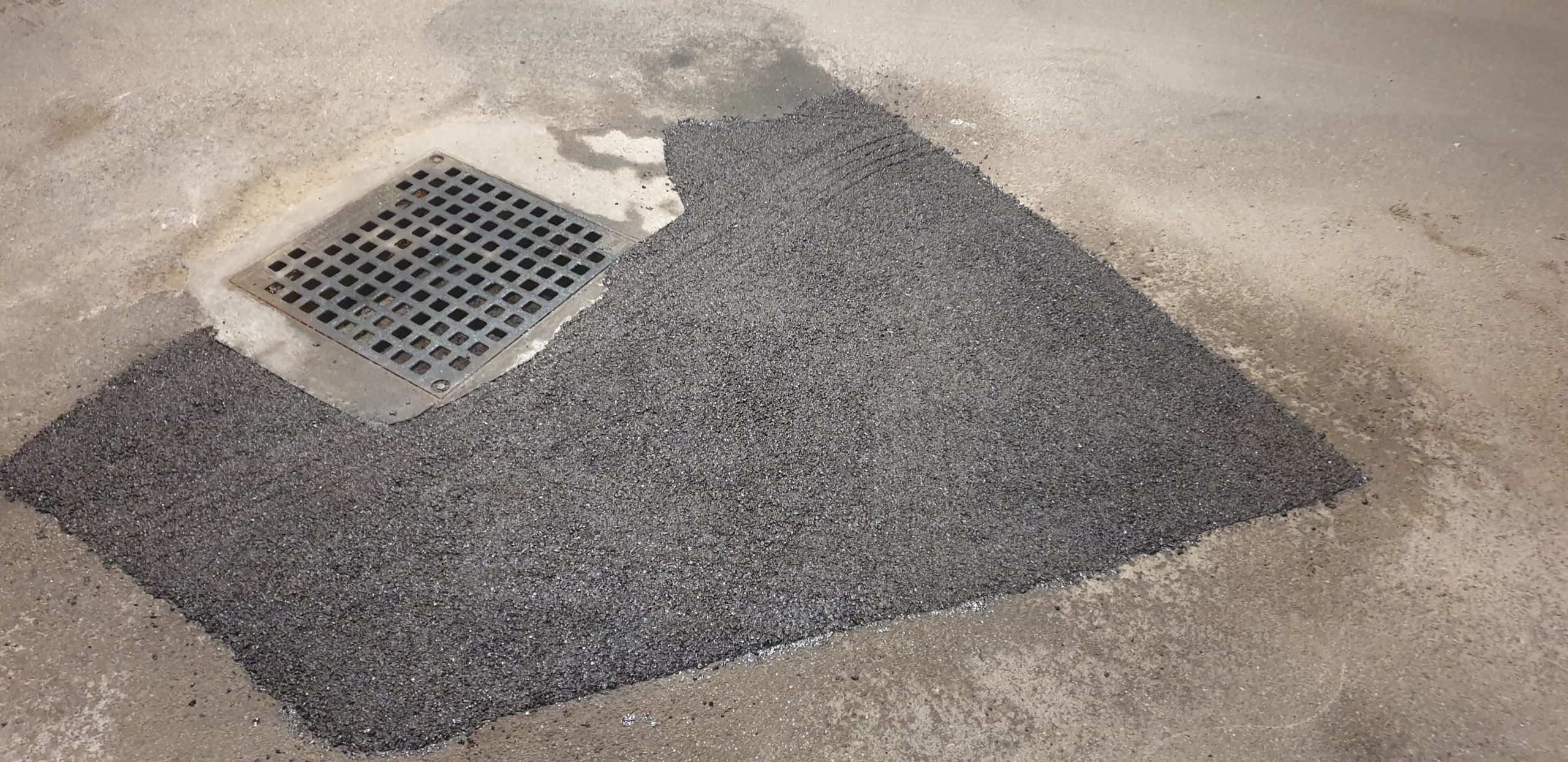Nachdem hier schon einige male urgiert wurde, waren am 06.10.2020 ein paar Arbeiter Vorort die den Boden reparieren sollten, leider wurde das wieder nicht professionell sondern im Pfusch gemacht. Es wurde einfach eine Teer-Kies-Mischung in die Löcher gekippt, bei der zweiten Stelle dürfte ihnen dann das Material ausgegangen sein, da wurde nur mehr Teilweise repariert und auf die Nivellierung wurde gleich verzichtet.
